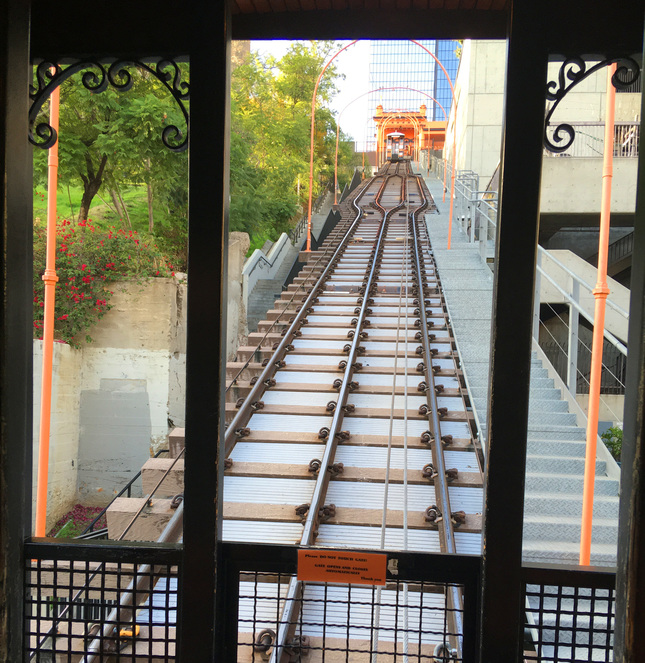 How wrong I was. When my husband was planning our Anniversary celebration in Los Angeles recently, he stumbled across a reference to “The world’s shortest railway.” Since we are both railway buffs, riding the Angels Flight went on our itinerary immediately.